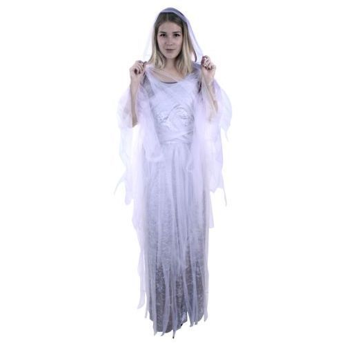 Met deze Victoriaanse geest jurk maak jij indruk tijdens themafeesten, Halloween of Carnaval. Deze witte jurk is inclusief capuchon.